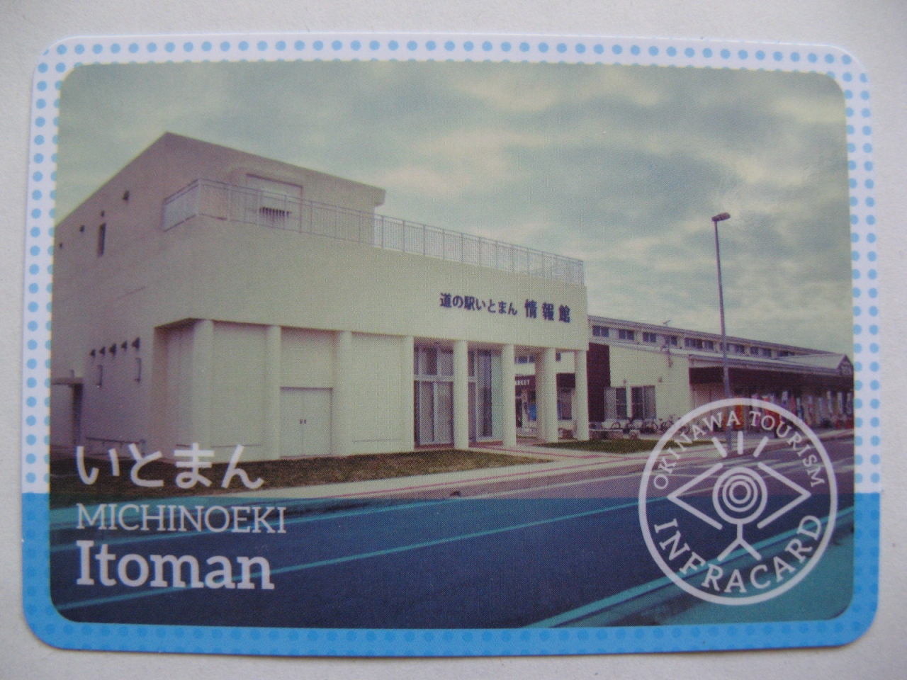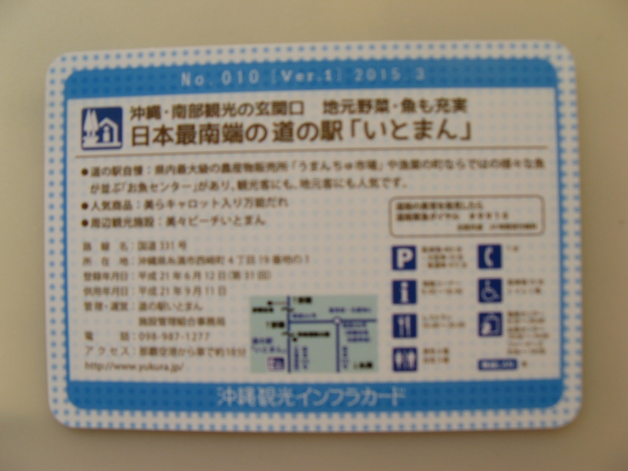 館内に常駐されているスタッフの方から、『内閣府沖縄総合事務局が観光客を含め一般の方に、観光に貢献するインフラに関し、広く容易に理解してもらうために作成した』という“沖縄観光インフラカード”について説明があり、“道の駅 いとまんインフラカード”を頂くことができました。