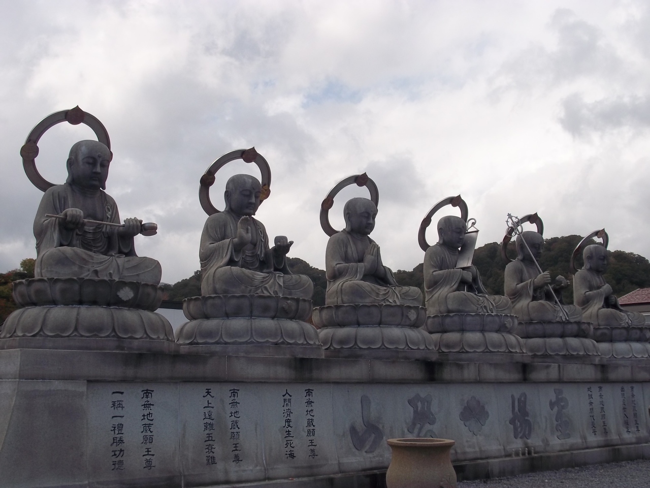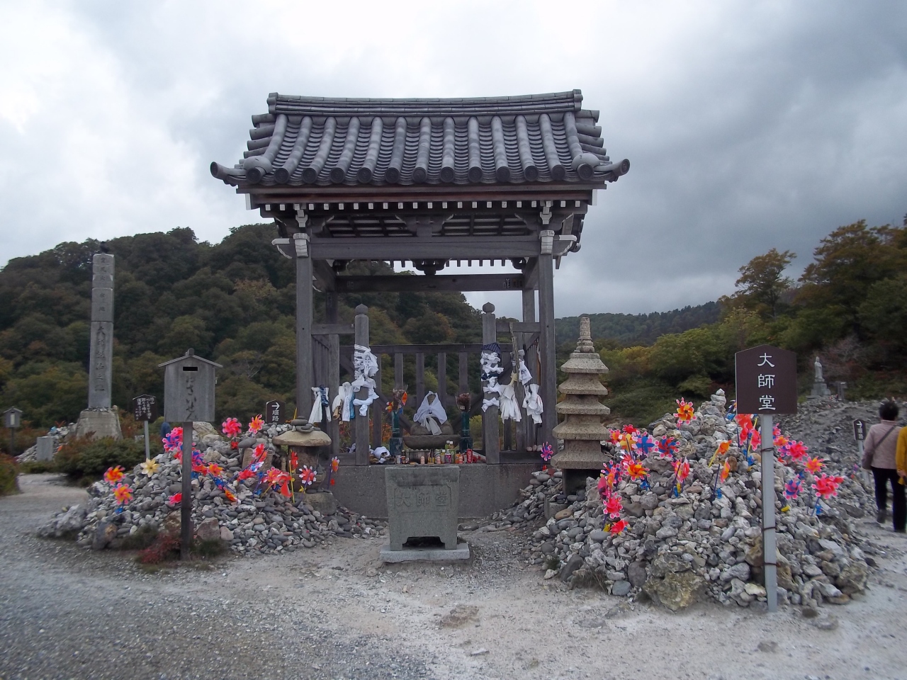 地蔵に供えられた風車が回る音が物悲しく、硫黄の匂いが立ち込める荒涼とした岩場と、その先にある美しい極楽浜の対比が印象的です。