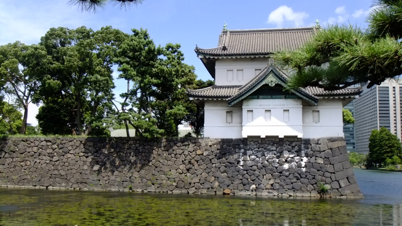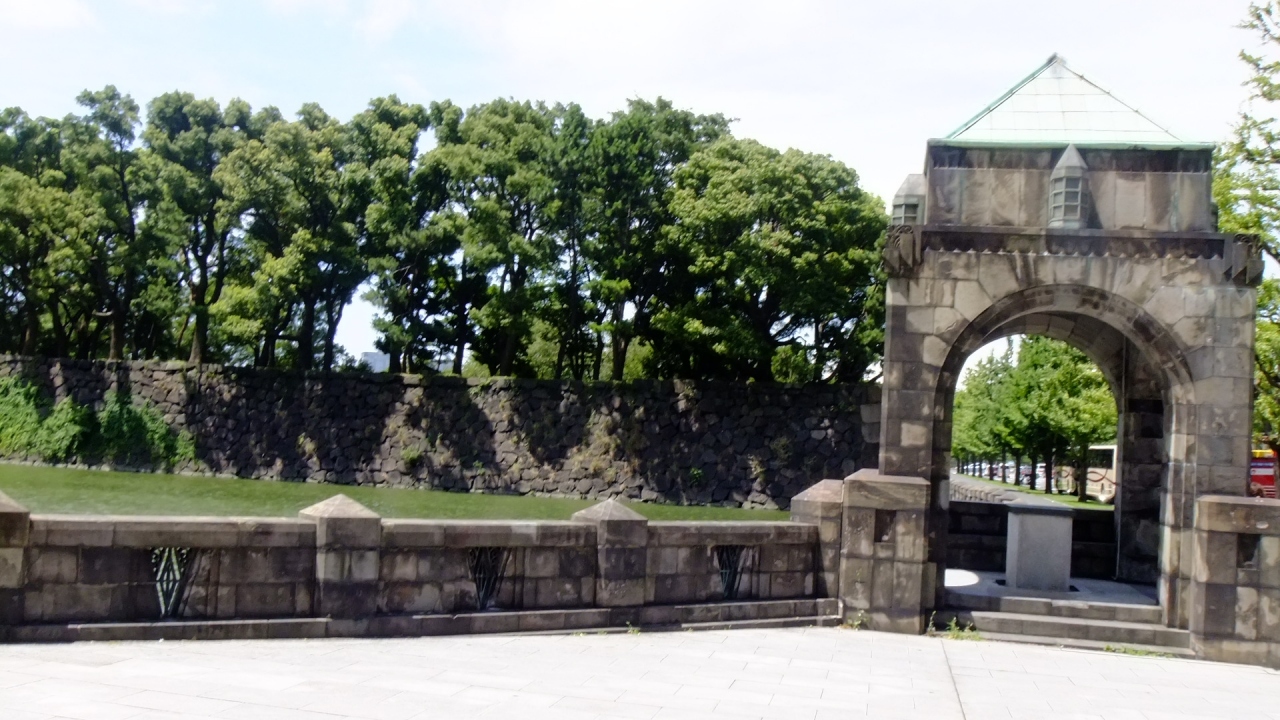 東京駅の方面から皇居方面に行く際に、大きな江戸城のお堀を渡るのですが、その際に通るのがこの桔梗門橋です。橋の両側は整備されていて、お堀の緑や江戸城の建物が見えるので素敵です。この橋をわたると桔梗門。皇居見学の際の集合場所になっていました。