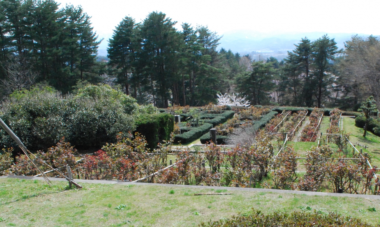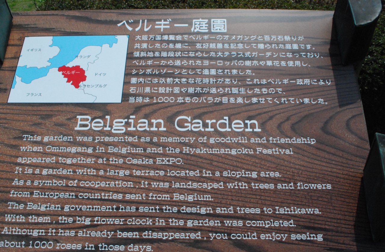 金沢氏は、ベルギーの言都市と姉妹都市協定を結んでいるので、その縁でベルギー庭園が公園の一角に作られました。当初は、花時計もあったそうで、それなりに手も加えられていたようですが、現在は、整備はされているもののお座なりの感が否めません。幾何学模様の生け垣の中にバラの木が植えられていて、花時では印象が違うかもしれません。