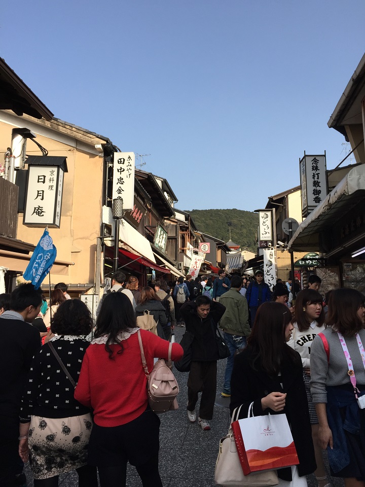 三月下旬の桜にはまだ少し早い時期でしたが、外国人や卒業旅行風な和服のお嬢さん方で大変なにぎわいで、歩くだけでも精一杯でしたが、振り向いてもまた人混みで、買い物も食べ歩きも楽しむどころではありませんでした。
