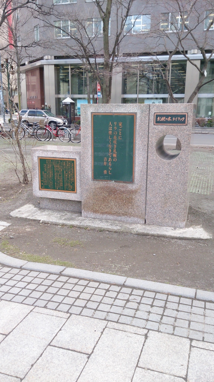 大通り公園の東側にあって、市営地下鉄の大通駅からすぐの場所にあります。自分が訪問した時期は4月の初めで、緑がない時期のため少し寂しい感じでした。歌碑自体は吉井勇氏の歌が刻まれた、現代的なデザインでブロンズ版に記された歌が石碑に埋め込まれれる変わった歌碑だと思います。歌碑にはその説明文もあって親切なデザインのユニークなものだと思います。