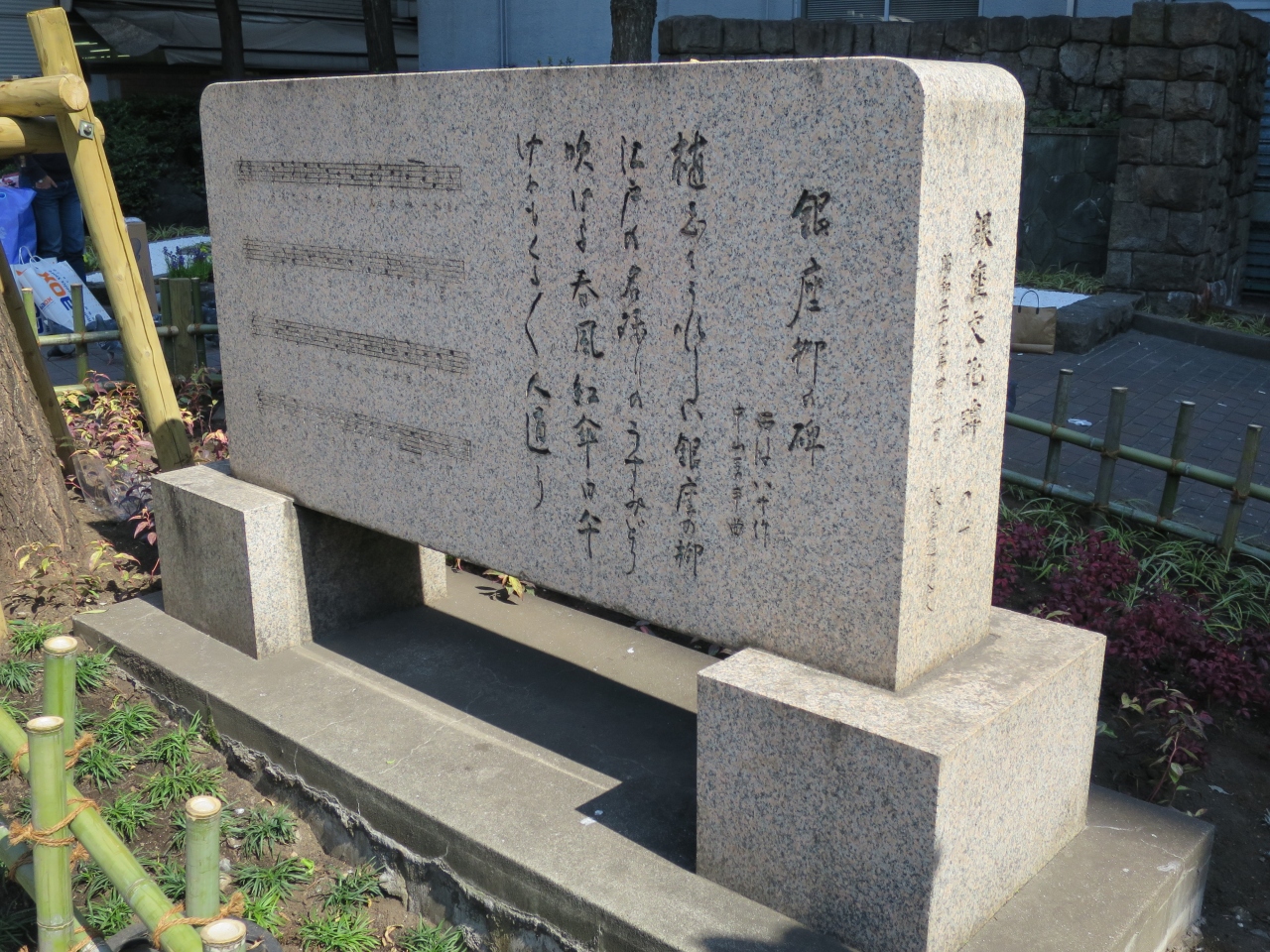 銀座中央通り八丁目の外れ、高速の高架を過ぎた辺りに、銀座の風景の柳並木を歌った、「銀座柳の碑」が建てられています。今は柳はありませんが、その昔銀座の街に植えられた柳を記念して建てられた碑で、碑には「銀座の柳」の楽譜が彫られています。