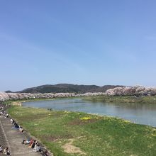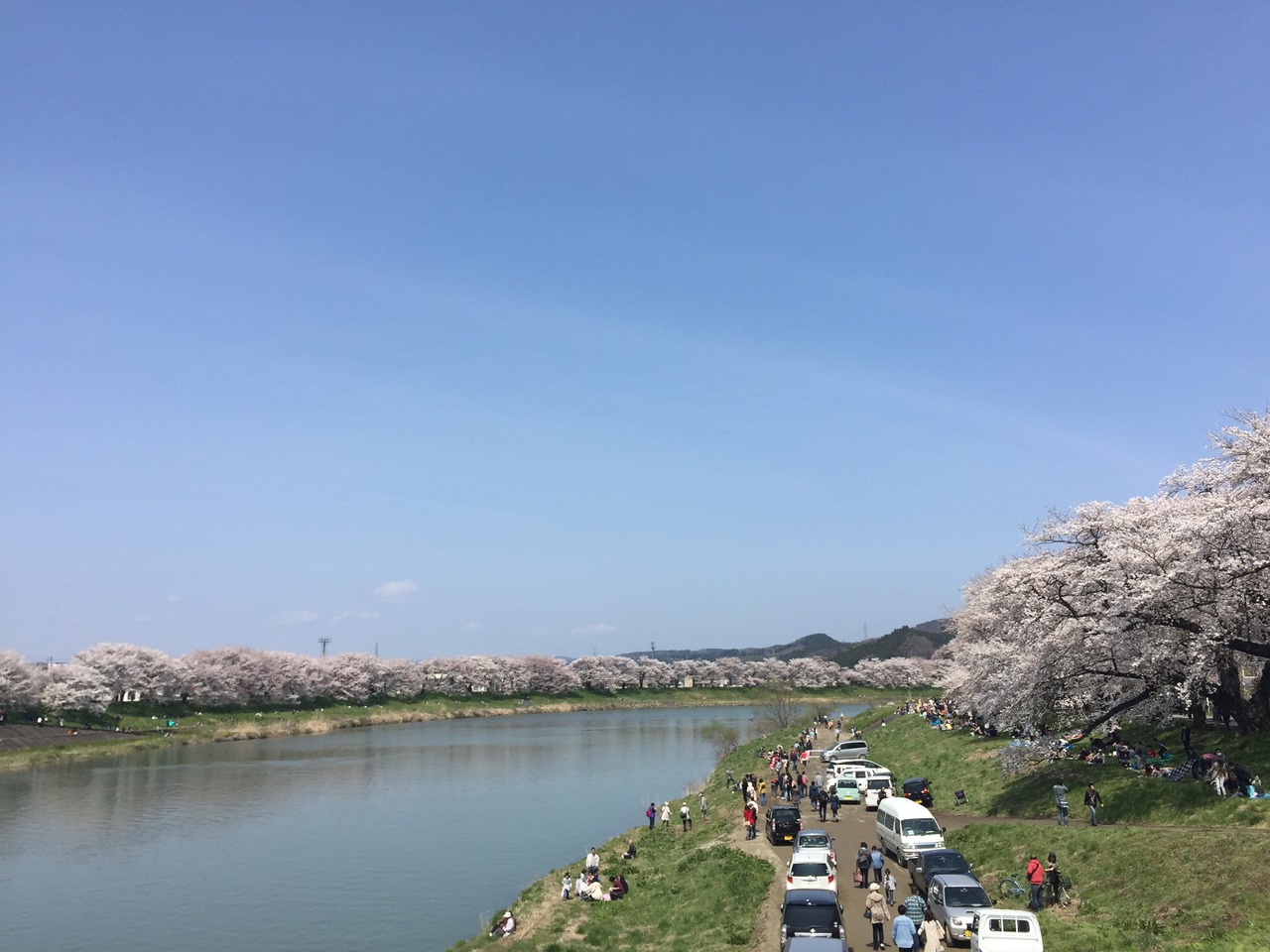 それでもしばらく歩けば空いてくるし 橋を渡って蔵王連峰側に行くと人も少なく ノンビリとお花見や そぞろ歩きが出来る。