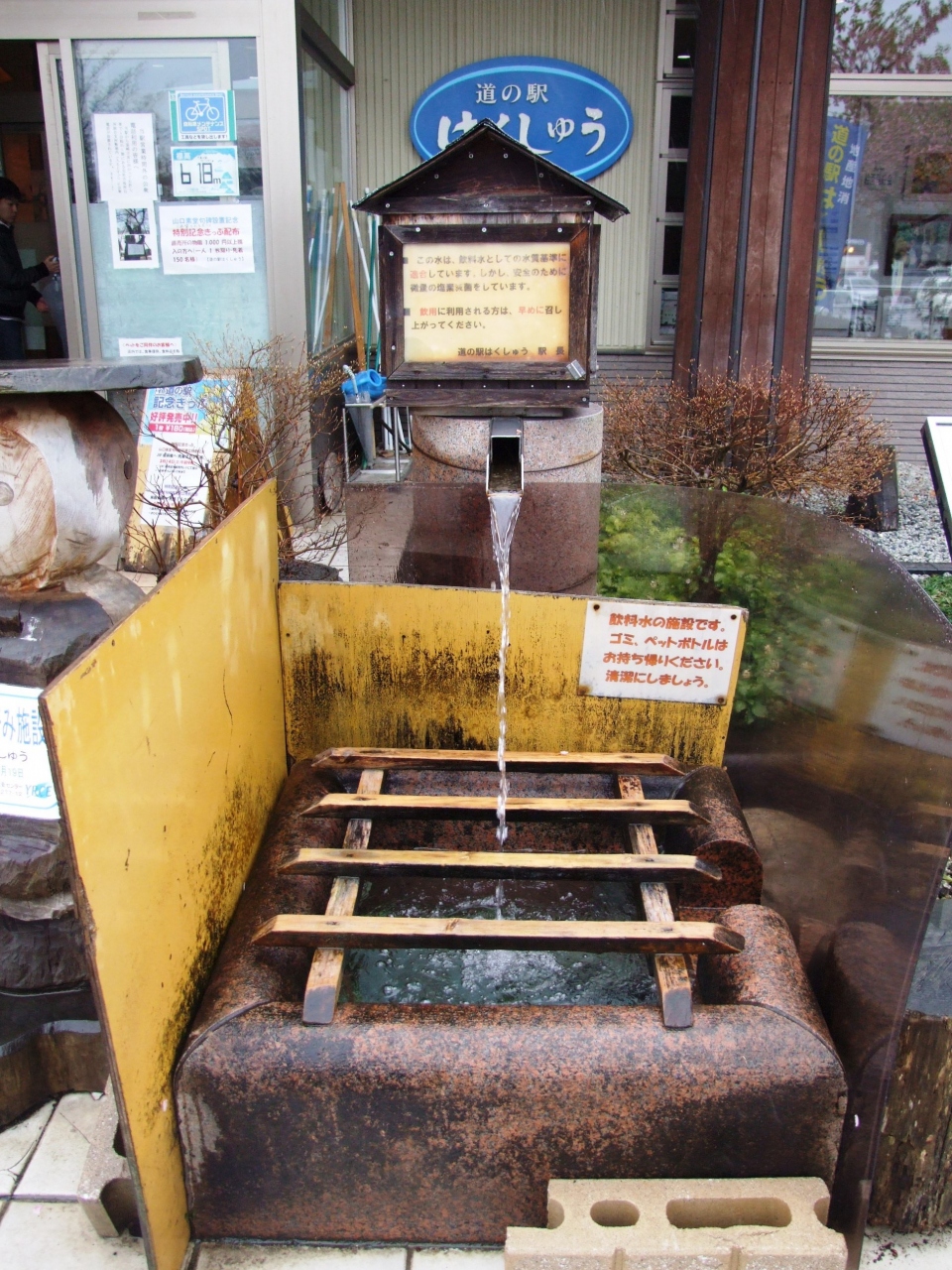韮崎からの帰り道に寄りました、街道筋です、駐車スペースはやや狭め、そんな規模の道の駅です。旬の野菜目当てでしたが、ここでしか買えない物は無し、椎茸と菜の花を購入、名水を誇る?(微量の塩素で消毒してるようです)白州の水の持ち帰りが出来ます。
