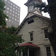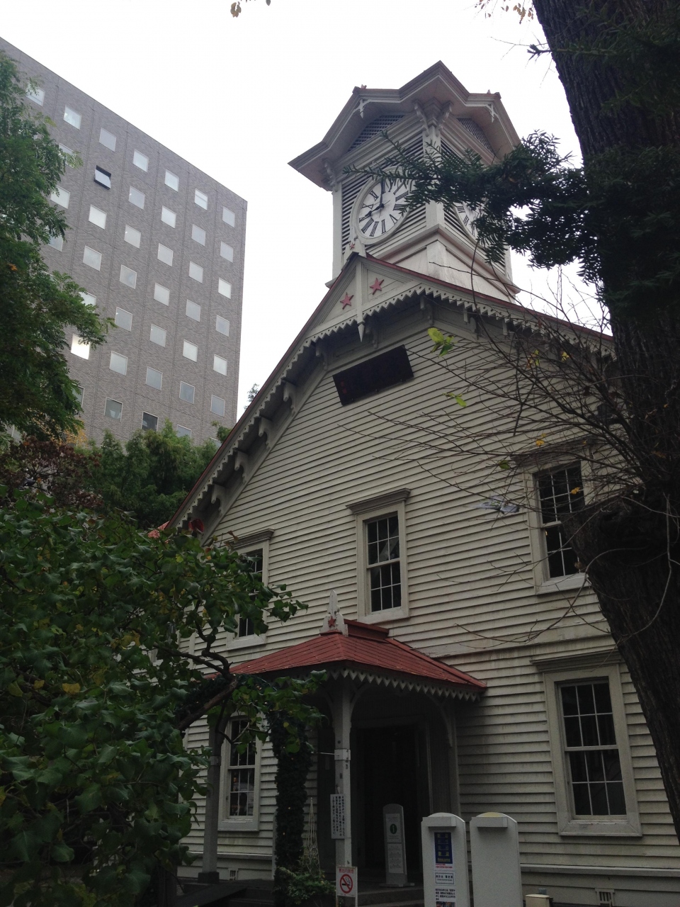 札幌の大通公園のすぐ近くにあります。ビルの谷間にひっそりと建っていると知っていましたが、ビルの谷間に建っていました。現在は、ビルの谷間に存在するため大変小さく見えますが、高さは 時計塔の先端までが約20メートルあり、現在のビルの高さに換算すると5階に相当するそうです。時計台の鐘は、毎時間、時の数だけ鳴るそうで、ちょうど見学したときも9時の鐘が9階鳴りました。鐘の音、良いですね。