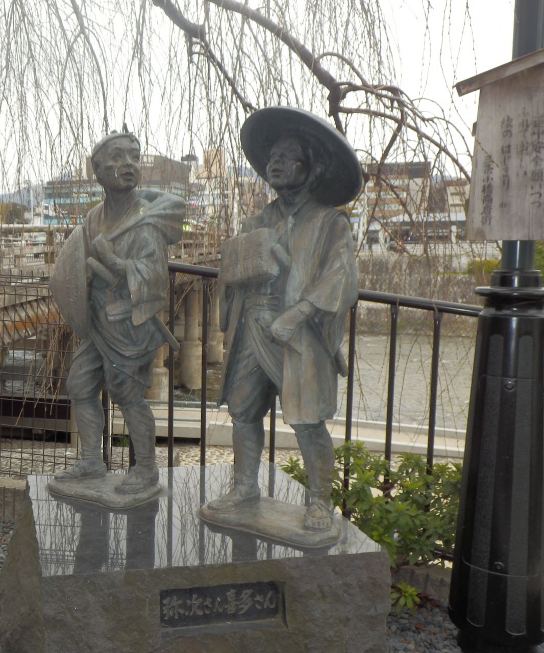この像は江戸時代後期に十辺舎一九が書いた東海道膝栗毛に登場する、弥次さん喜多さんを三条小橋商店街振興会が二科会の会員で彫刻家の小山由寿先生に製作を依頼して平成6年に建てられたものだそうです、三条大橋西詰の南側に立っています
