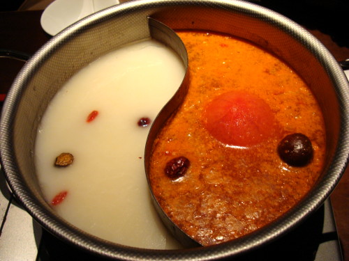 鍋。白いスープとトマトの赤いスープをチョイス。ちょっと辛いのがいいなぁ〜と思ったけれど、スパイシーなスープは激辛なんだそうでパス。