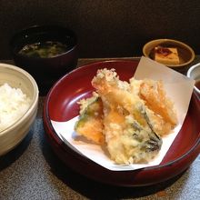 天ぷら定食700円を注文。ネタは、にんじん、椎茸、茄子、南瓜、玉ねぎ、イカ、海老二尾、ご飯、味噌汁、やっこ、漬物です。