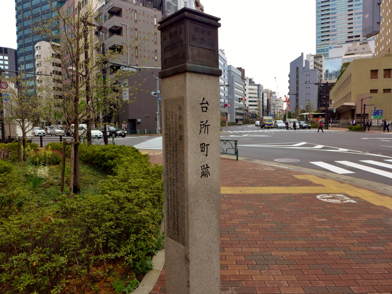 JR飯田橋駅から九段下へ向かう目白通りの飯田橋一丁目の信号脇に「台所町跡」を記した標柱が立っています。