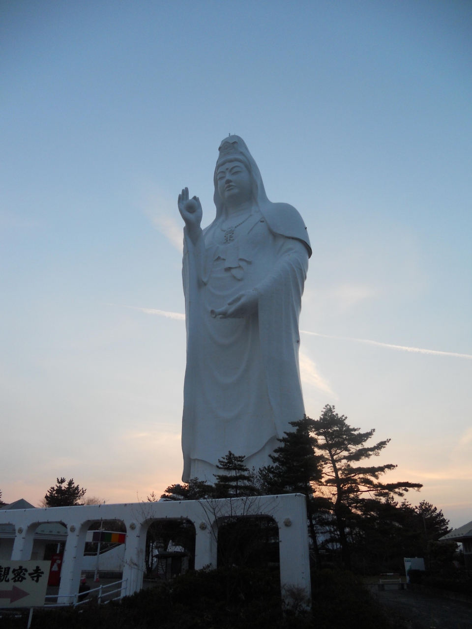 仙台市の西部、泉区の八乙女から北環状線をひたすら西方面へのぼっていくと、右手に巨大な観音様が見えてきます(仙台駅前のSS30など高い建物の高層階からもこちらの観音様は見えます)。すぐ隣にはゴルフ場やホテルがある高台(山?)に建っているのでとても目立ちます。4月末までは午後3時30分までらしく、すでに閉館した後でしたので私たちは観音様の中には入りませんでしたが、500円の支払ってお札を受ければ、中に入ることができます。閉館後だったからかもしれませんが、周囲には誰もいなくてちょっと怖かったです。。
