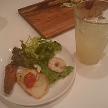 最初にカナッペとエビのマリネ、チキンバーの乗ったプレートが出てきましたが、それが前菜盛り合わせの1品ではなく、3品にカウントされていたのは何だか残念でした。チキンバーなんて一人一本だし。