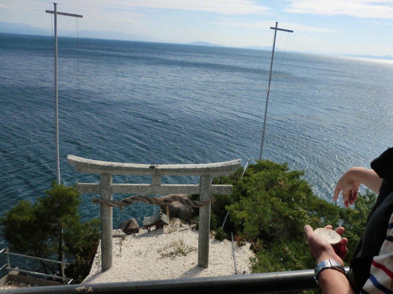 海に突き出した竜神拝所の鳥居に向かってかわらけ投げをしたり、