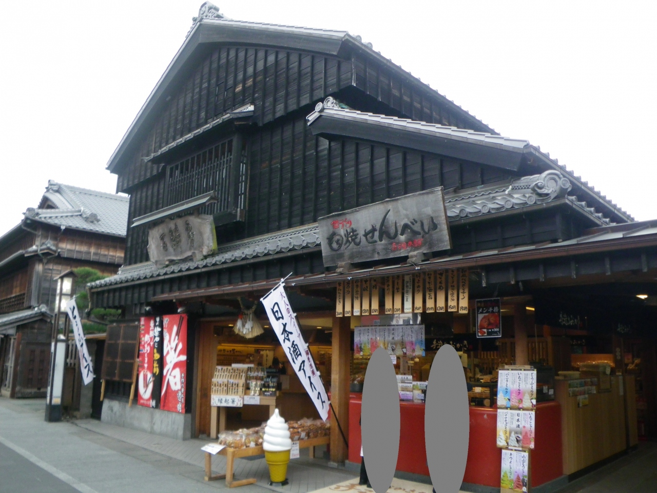 おはらい町通りを歩いているとお醤油の香ばしいにおいがしてきました。寺子屋本舗は白焼きのおせんべいやさんで、食べ歩き用に一枚から販売しています。伊勢ならではの伊勢金ごませんべい¥150を購入!醤油せんべいの表面にごまをたっぷりまぶしているおせんべいで美味しかったです。