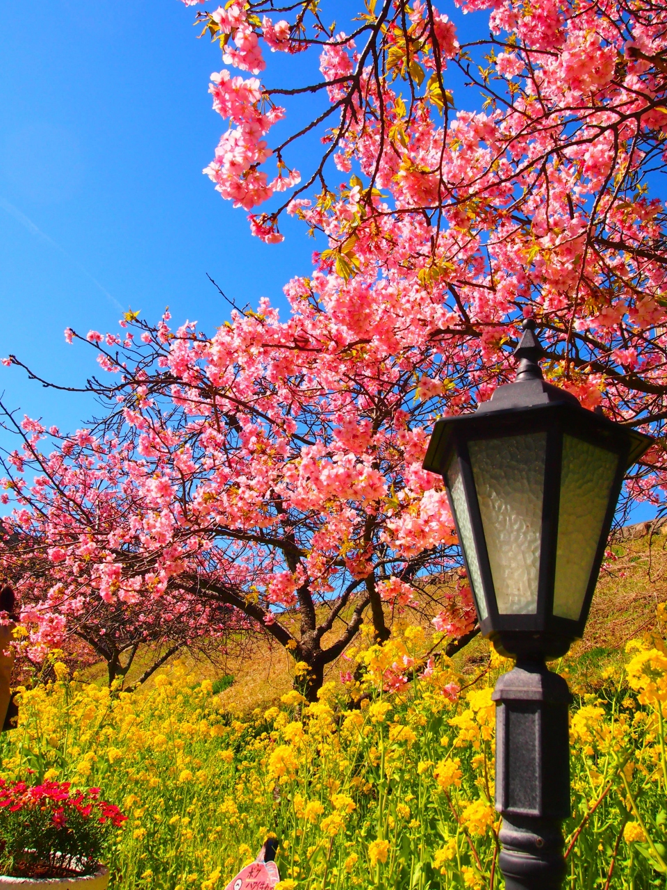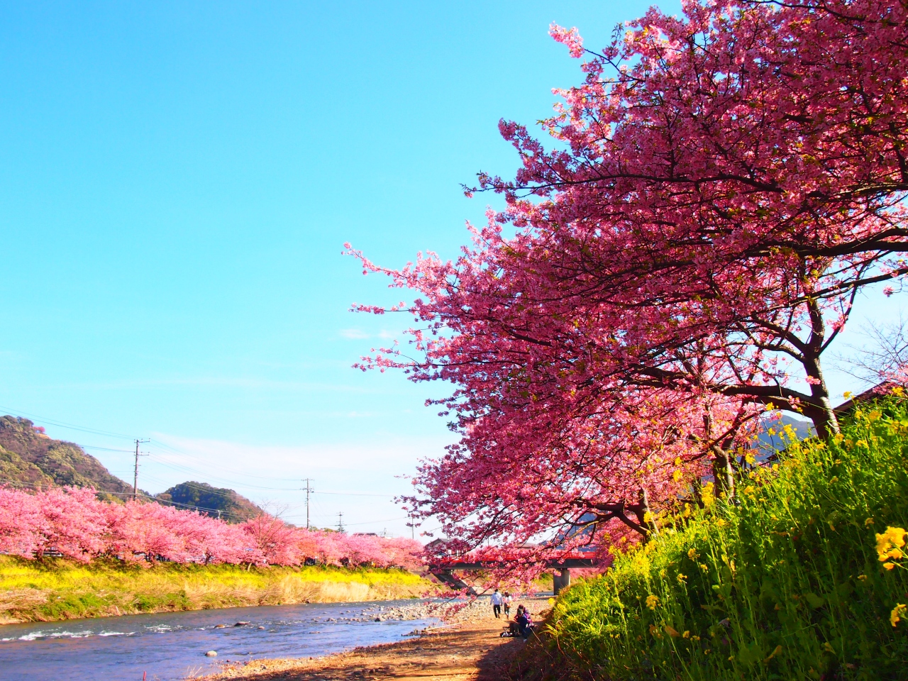 河津駅を出て、満開の菜の花と河津桜のコラボを楽しめる駅前通り(桜の期間中は歩行者天国)を歩いていくと、河津川の土手にぶつかります。 この川沿いに、ずら~っととっても立派な桜並木が続いていて、とにかく素晴らしいです!! 両岸に、桜と菜の花のコラボを楽しめる所もありますが、駅からはちょっと距離があるかも(豊泉橋より向こうです)。