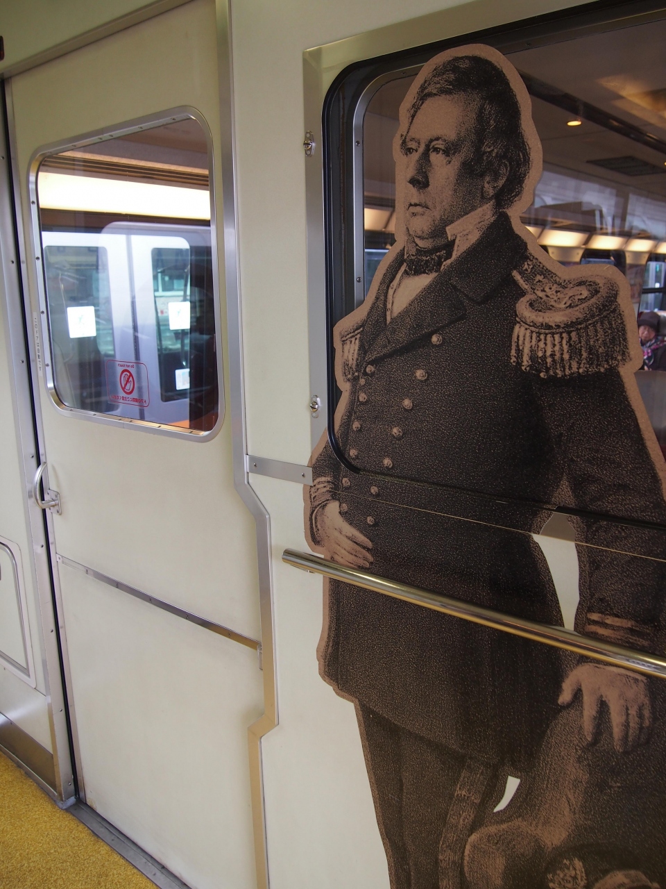 黒い車体がカッコ良く、ペリーの黒船をイメージしたカラーリングになっているようです。 車体の色だけではなくて、一両ごとにコンセプトが違うので、車窓からの景色(海がとってもキレイ!)だけじゃなくて、電車自体も楽しめるのが嬉しいです。 私は帰りも偶然この黒船電車に乗ったのですが、行きと違う車両に乗ったら、作りが違って驚きました。 行きは、ペリー来航の歴史など、当時の記事が壁にプリントされていて、幕末の時代を楽しめる感じ、帰りは、プラネタリウム仕様で、トンネルに入ると天井に星空や天の川が映し出されて、何も知らなかった乗客から、歓声が上がりました!