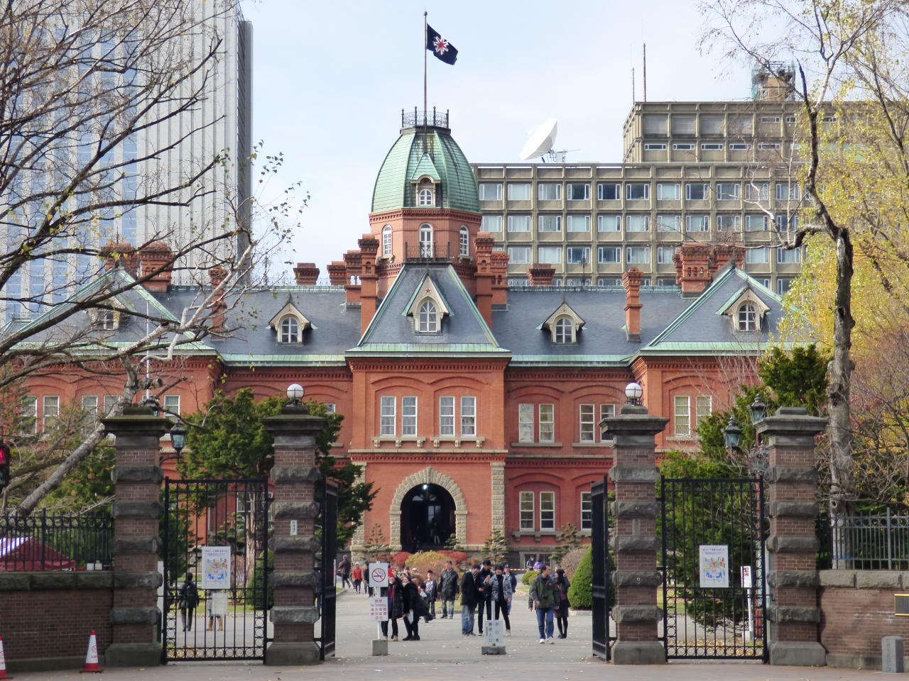 1888年に建設された旧道庁で、地元民の間では「赤レンガ」と呼ばれている国の重要文化財。正門前にはイチョウ並木がある。
