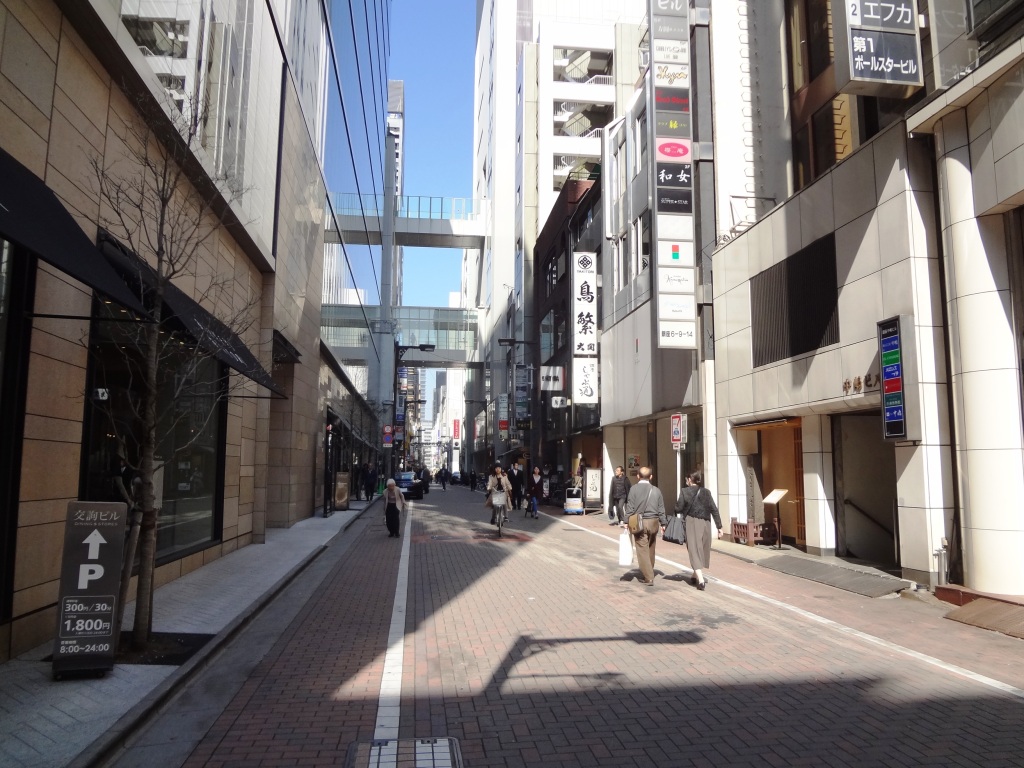 銀座の金春通りを南から北へまっすぐ進んでいくと、すずらん通りへと変わります。その切り替わりが高級衣料品のバーニーズニューヨークがある交詢社ビル。裏道だけど、レンガが敷かれとてもおしゃれな通りです。高級海外ブランドが林立するわけじゃないけど、ブルガリをはじめ、どこも高級な雰囲気を漂わせる店ばかりです。まっすぐ進むと、半世紀前、いっせいを風靡したみゆき族で有名なみゆき通りと交差します。
