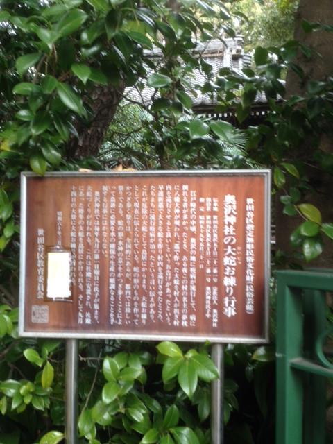 蛇が絡みついた独特の鳥居を有するこの奥澤神社には、大蛇お練り神事という行事が伝わっています。現在でも9月に行われるそうです。有形無形を問わず歴史的な文化財が姿を消していく中、地域の努力で継承されていることに感銘を覚えます。ぜひ見てみたいものです。
