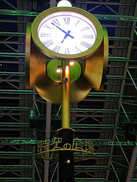 大阪駅ホームの上部を南北に横断する形で作られた連絡橋の、屋上部分です。エスカレーターで5階に上がると、すぐ目の前に大きな金の時計が見えます。天井が高く、開放感のある大きな広場になっており、その時々でイベントが行われているようです。行った時は丁度アニメ作品のカフェが期間限定でオープンしており、そこそこ賑わっていました。