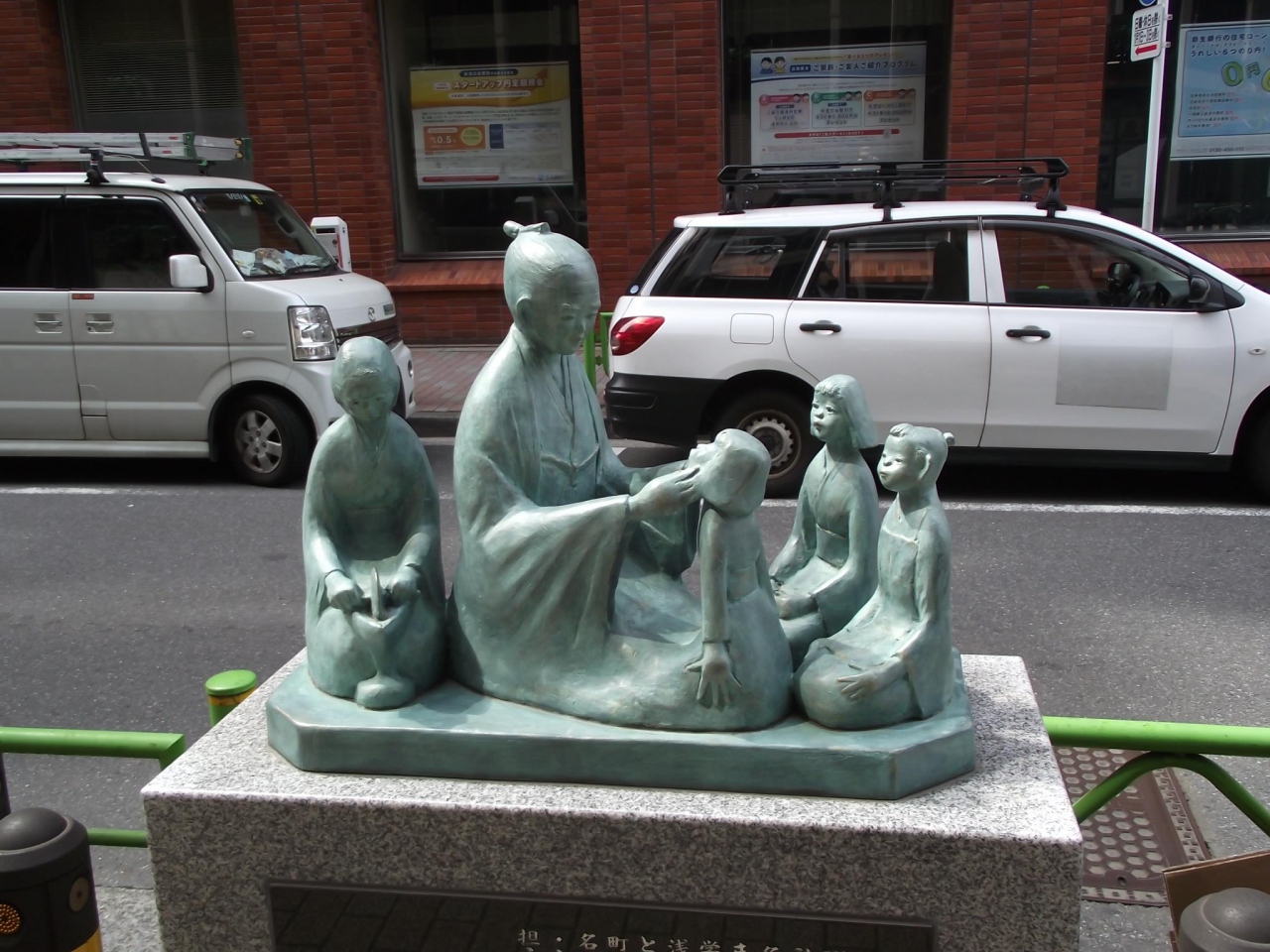 先日、JR東京駅八重洲側正面の八重洲通りの右手の歩道を歩いていて、最初の交差点の右側に、珍しい姿の座像を見掛けた。