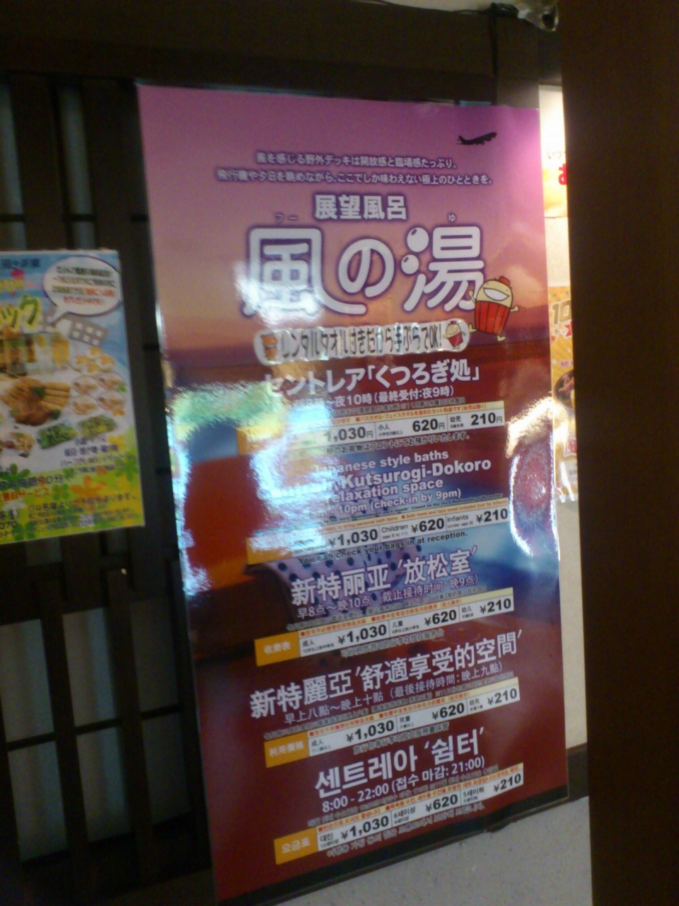 セントレアの4Fのちょうちん通りの中にある入浴施設です。海外からの飛行機を降りて利用しました。料金は、ハンドタオルとバスタオルも付いて1030円です。大きなトランクも預けることが出来ますし、小さなキャリーケースならそのままロッカーに入ります。天然温泉ではありませんが、湯船の中から飛行機の発着を眺められるのは、ここだけではないでしょうか。飛行機の長旅の後、手ぶらですぐにお風呂に入れるなんて贅沢です。