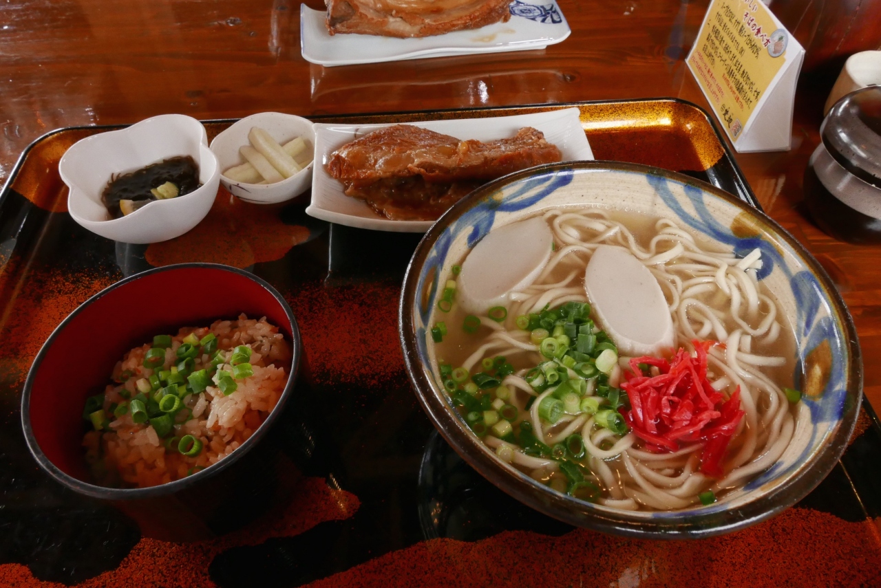 古民家でいただくソーキそばは絶品でしたよ。内装は古民家なのにシャンデリアが飾っていたり不思議な感じでした。