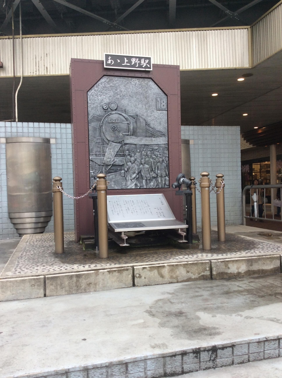 JR上野駅の広小路口を出て、マルイに渡る信号の右側にあります。平成15年(2003年)に、集団就職で上京した中小企業経営者らの有志団体によって建てれた、高度成長期の世相を描いた代表的ヒット曲「あゝ上野駅」の歌碑です。