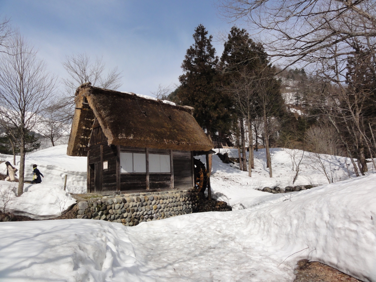 春が遅く雪が残っていました。平日の10時前に到着しましたが、せせらぎ公園の駐車場にはすでに観光バスが数台停まってました。駐車場から土産物店やカフェ等もある通りへ行くにはであい橋を渡っていきます。県の重要文化財9棟が並ぶ合掌作り民家園は駐車場からすぐでした。