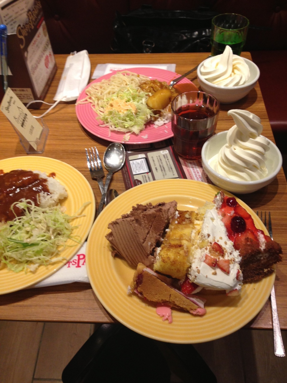ケーキ、ソフトクリーム、パスタ、ピザ、ポテト、カレーなど甘い物だけではなく色々あるので甘い物を食べ飽きてからも楽しめます。