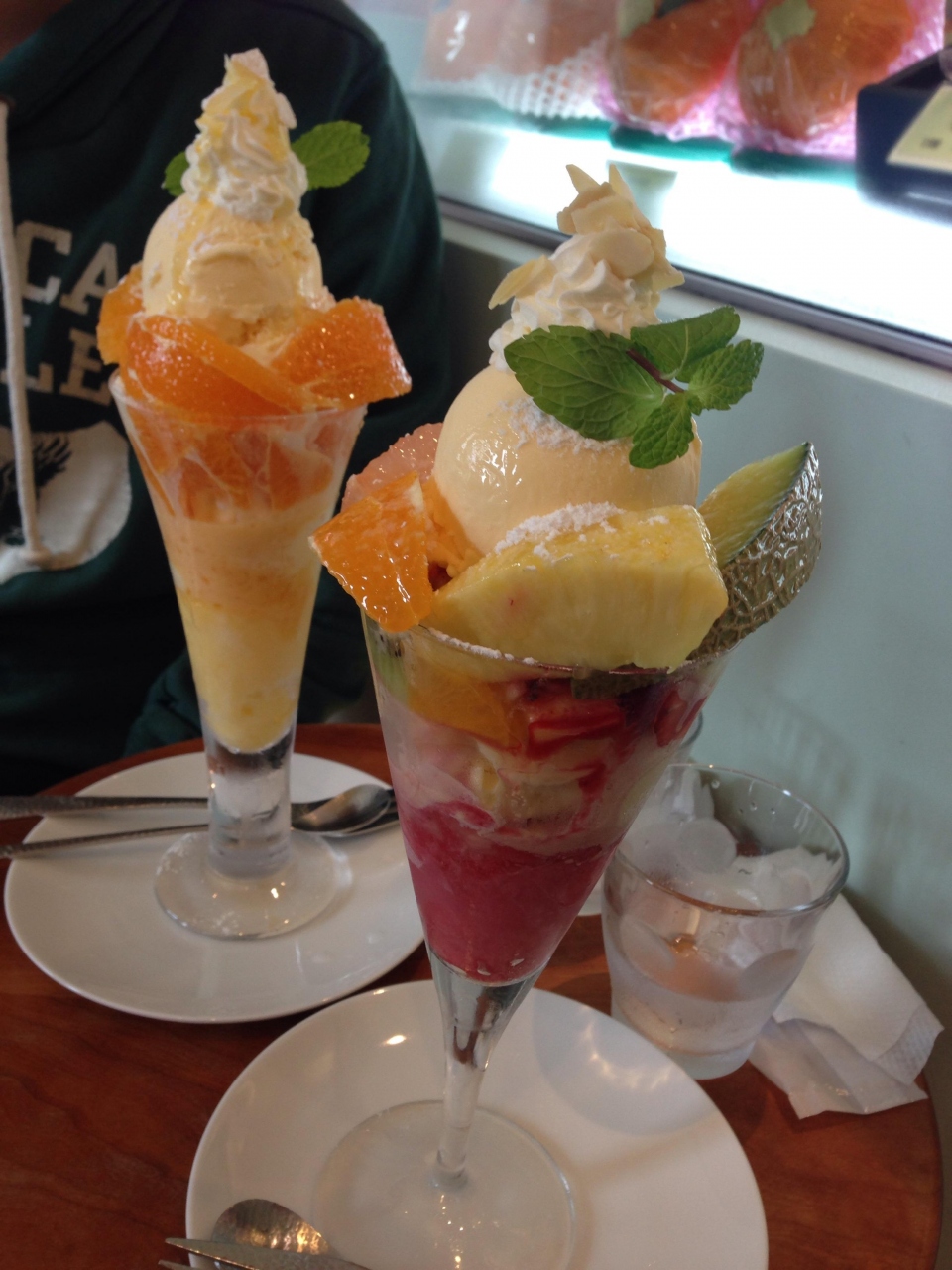 感激しました。フルーツパフェはメロン、パイナップル、ピングレ、デコポン、バナナ、