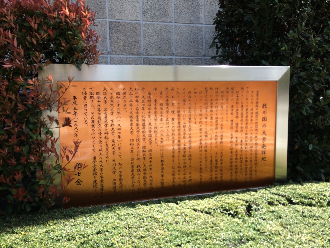 同じく学士会館の敷地内にある「日本野球発祥の地」の記念碑に比べてるとさすがに地味ですが、風格を感じさせる立派なものです。