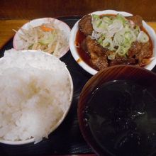 お昼はモツ煮込みと牛スジの定食がありましたので、牛スジの定食をオーダー。
