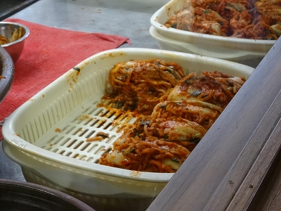 バスを降りてお店に入ると、まずはキムチを漬けているところを窓越しから見学。