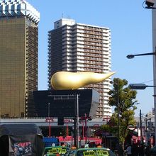 東京のスカイツリーの近くにあるアサヒビールのビルです。ビルの屋上にモニュメントが乗っています。モニュメントは黄金の色なのに黄色く見えることから、よくあるものに見間違えられます。本当は炎らしいのですが、それなら赤にでもすれば良かったと思うのですけどね。