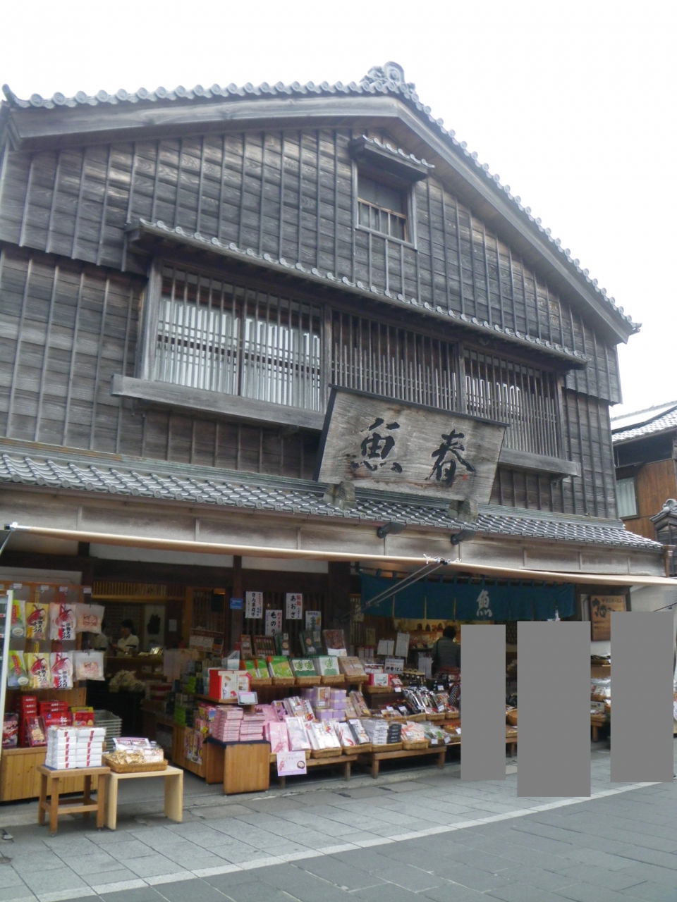 「魚」というのれんが目に入ったので魚屋さん?と思いきや、海産物を扱うお店でした。干物や海藻類に菓子類もあり商品の種類は豊富です。中でもサメの肉を天日干しにした「さめのたれ」という干物が有名で、伊勢神宮への供え物でもあるそう。塩干しタイプはややクセがありますが酒の肴に◎でした。