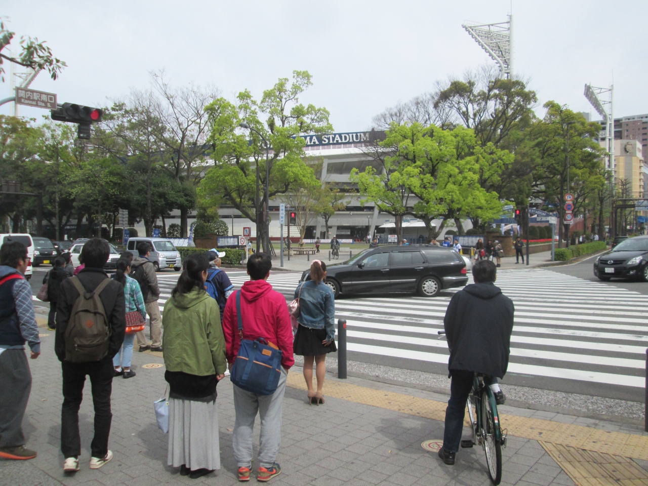 2015年度のプロ野球が始まり、ナイトゲーム開催の日は午後から駅周辺が混雑します。この日は前日の試合が雨のため中止になり、今年としては最初の巨人戦でした。南口改札を出るとスタジアム方面に向かう方がいました。