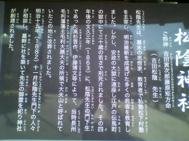 第一印象は結構新しい神社だなぁ…と。境内には松下村塾を模した建物や、松陰先生の銅像、松陰先生の墓所もあり、見所たっぷりです。