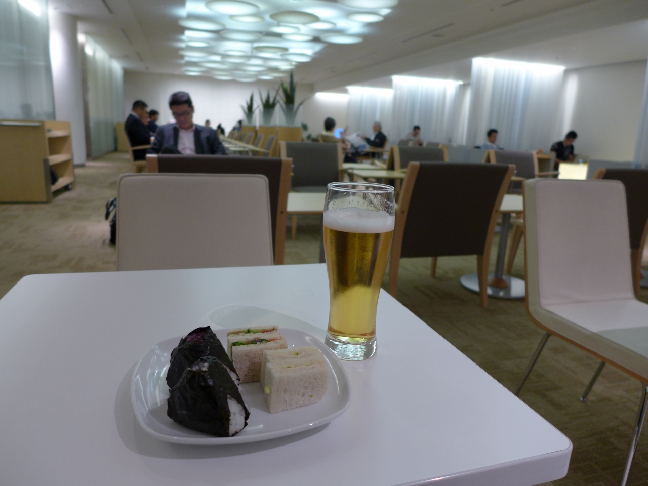 国内線のラウンジはたいていソフトドリンクやスナック菓子などしかありませんが、ここでは生ビールを含むアルコール類、ミニサンドイッチやおにぎりなどの軽食も置いてあります。おにぎり、美味しいので好きです。