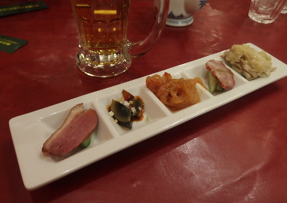 前菜は「アヒルの冷菜」「ピータン」「クラゲの冷菜」「炭火焼き叉焼」「蒸し鶏の冷菜」