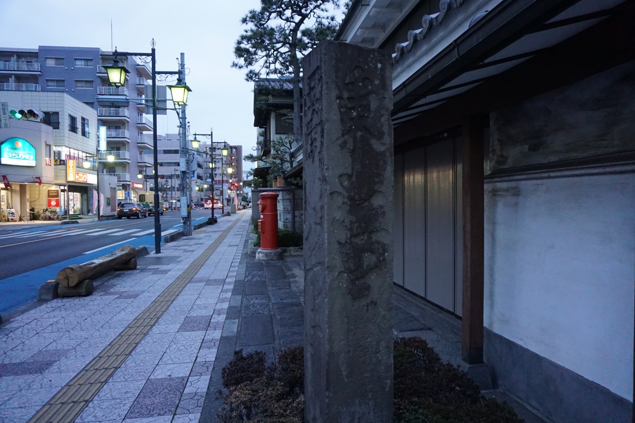 日光道中の道しるべは、かすかべ大通り沿い。旧商家 東屋田村本店前に建つ大きな石柱です。天保5年と刻まれた文字がよく分かります。標識として、日光、岩槻、江戸の三方面の方角が刻まれているようですが、それはちょっと読み辛いと思いました。