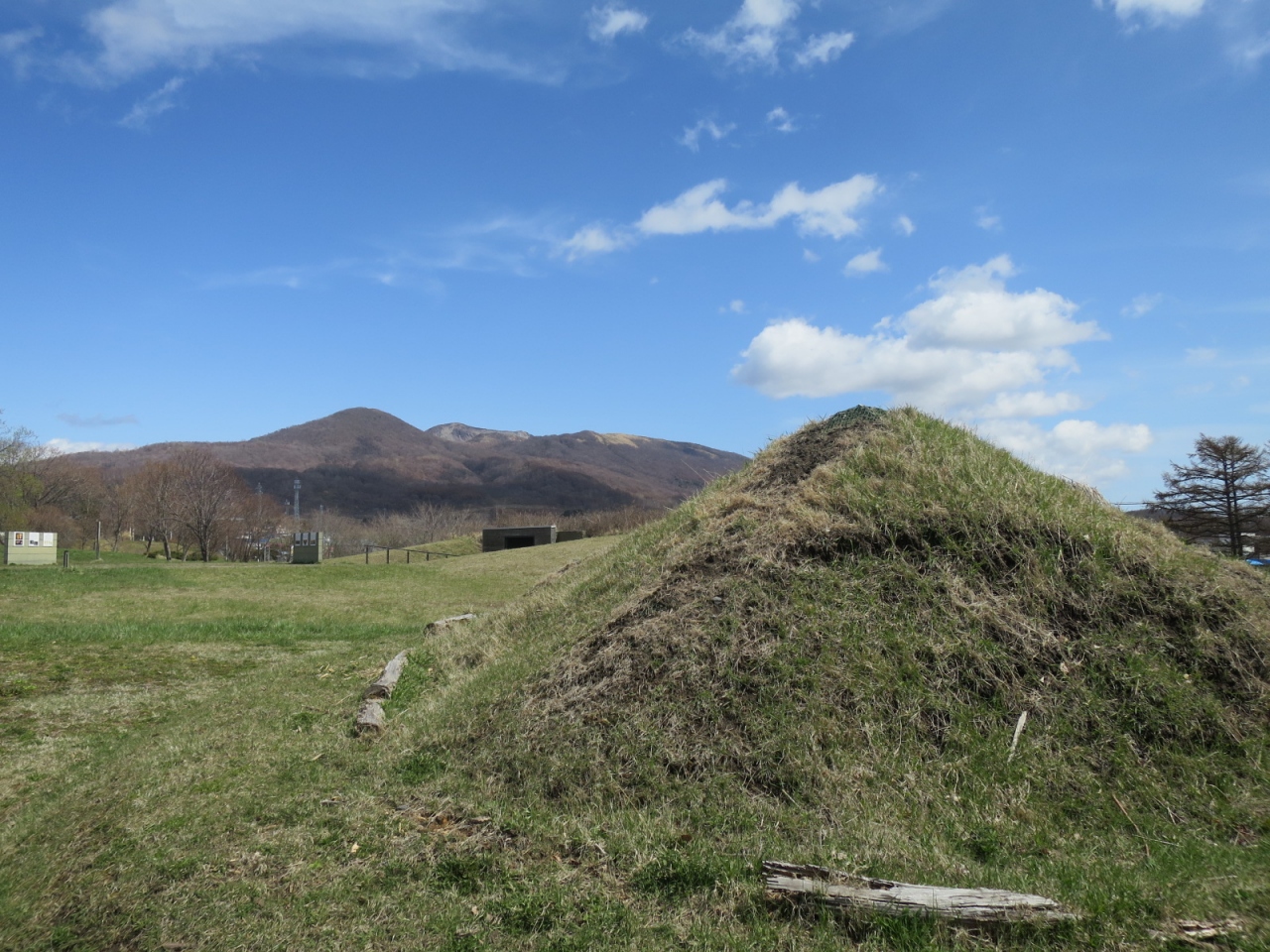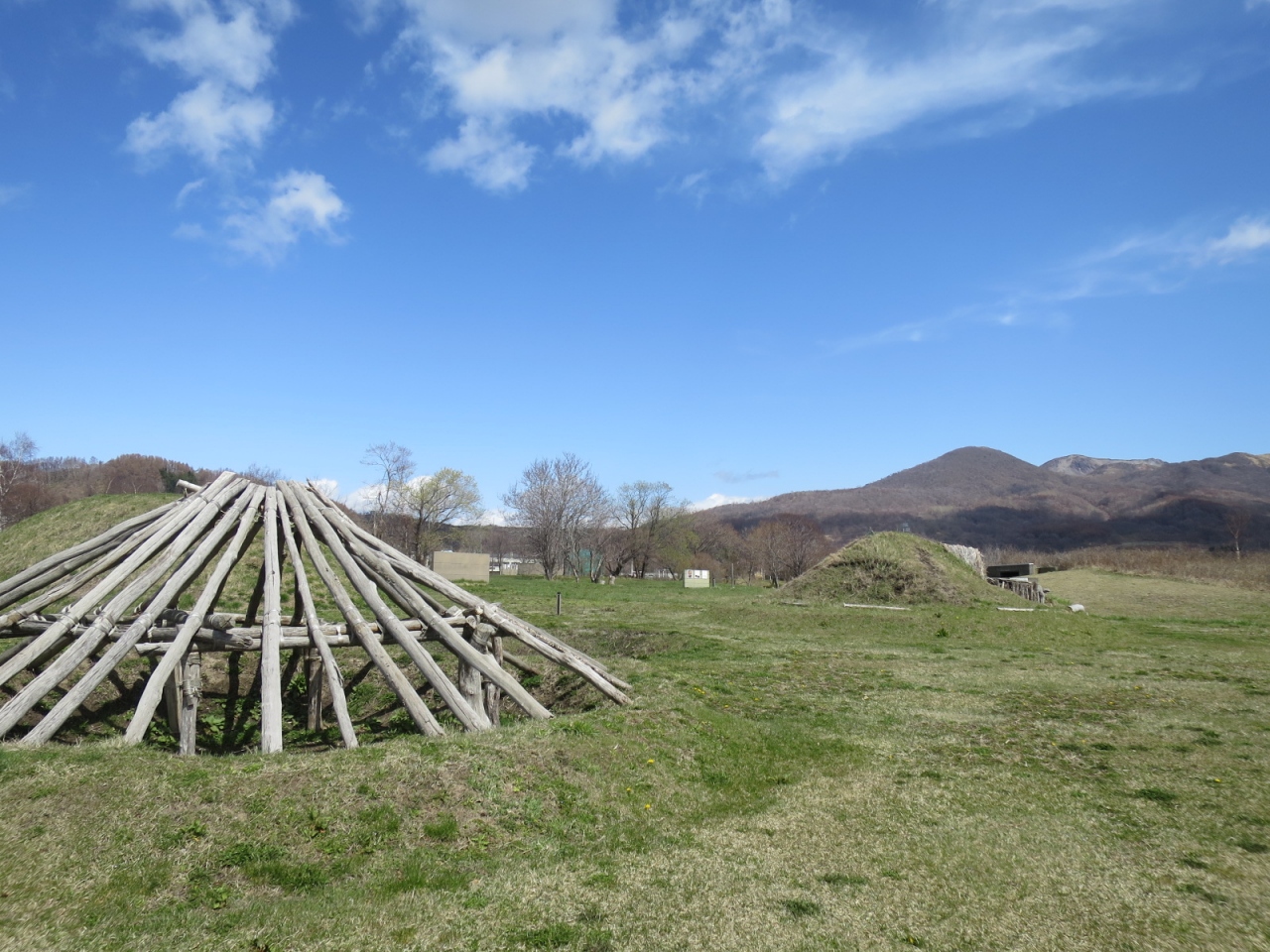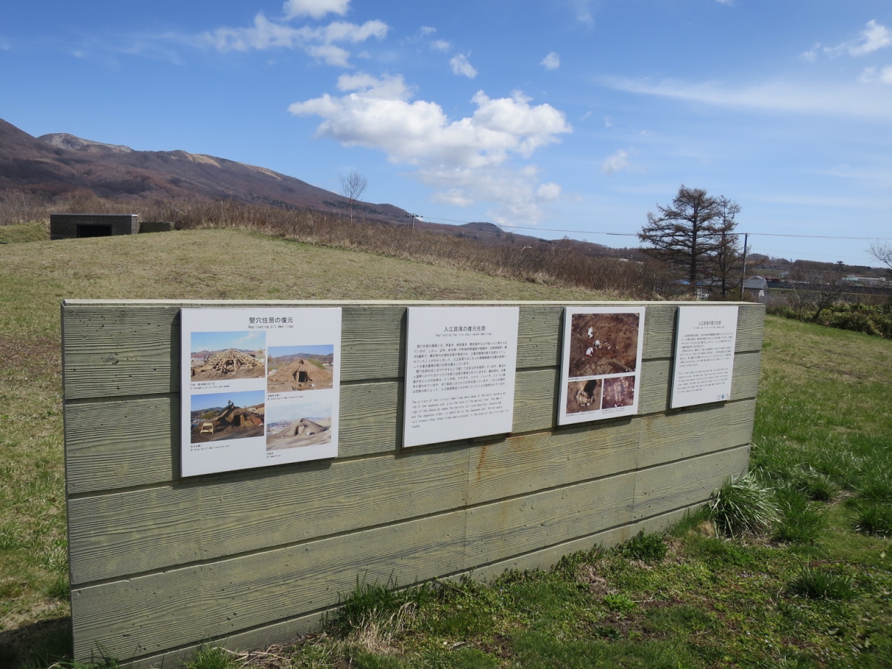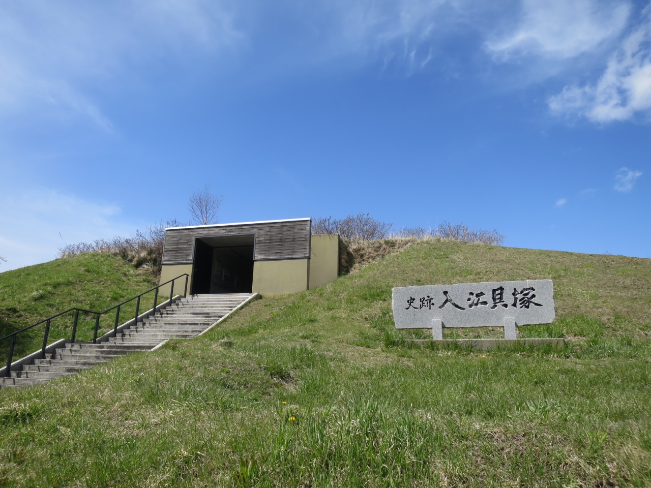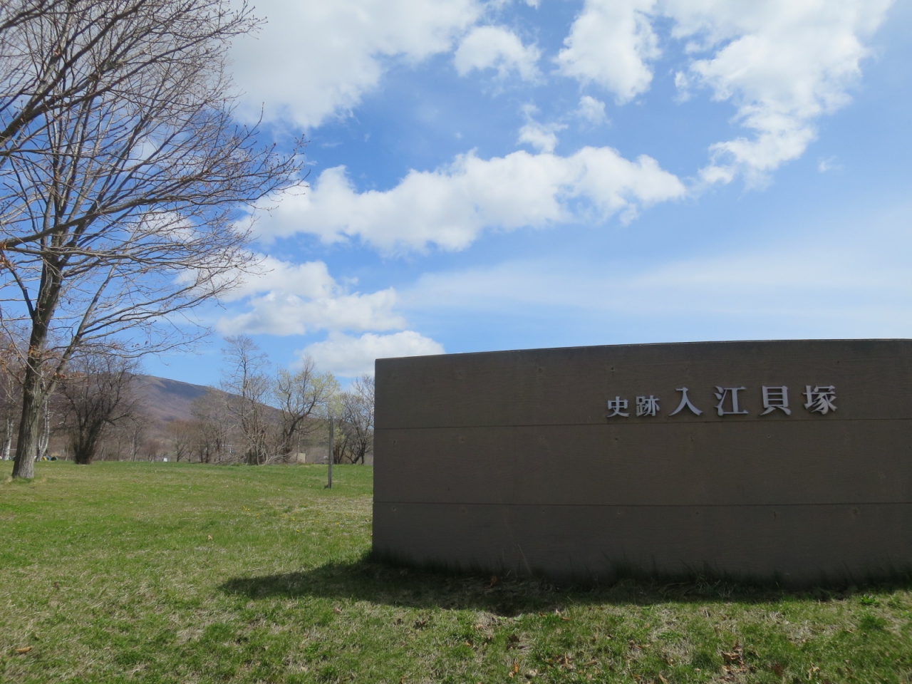 入江貝塚公園は、噴火湾や有珠山を眺める高台の草原で、晴れた日は眺めもよく気持ちが良いです。散策によいです。西向きなので夕日もきれいかもしれません。あたりは住宅地で、お店などは国道37号線まで下らないとありません。300mほど離れたところにある入江・高砂貝塚館では土器や石器などの出土品を展示しているので、合わせて見ていくと良いです(4月~11月)。駐車場もあります。なお、その先にある高砂貝塚跡の方はただの草原で、道路脇にぽつんと案内看板が立つのみです。