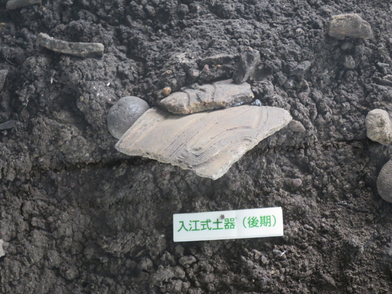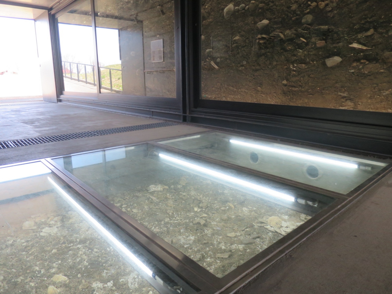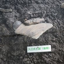 貝塚を輪切りにして中の堆積物の様子を間近で眺められます。意外と貝ばかりではないという印象です。この地方の貝塚はゴミ捨て場ではなく、人や道具なども埋葬する神聖な場所だったようです。同じような遺跡に、ここから南へ15kmほどの国道37号線近くにも北黄金貝塚史跡があります。