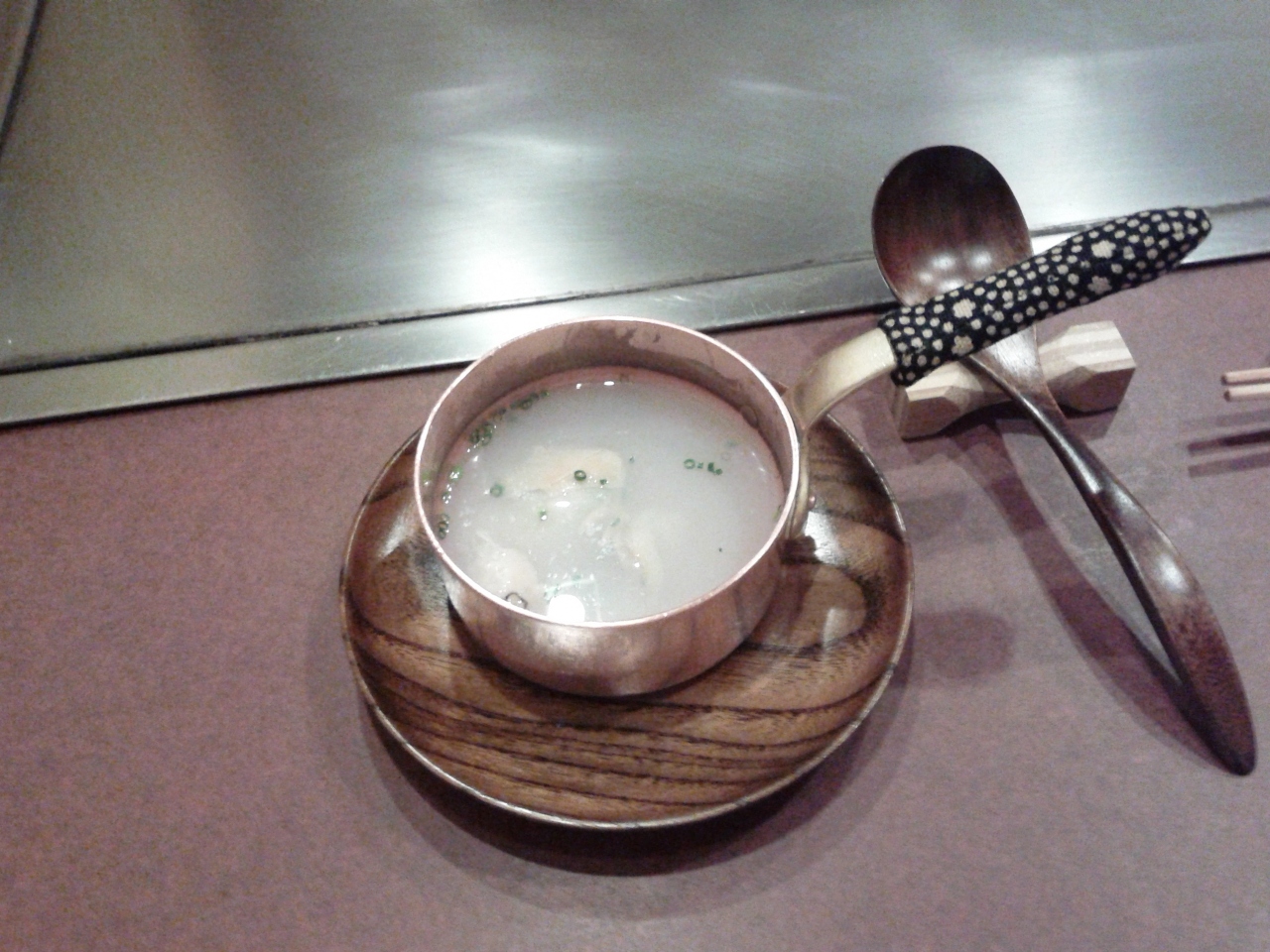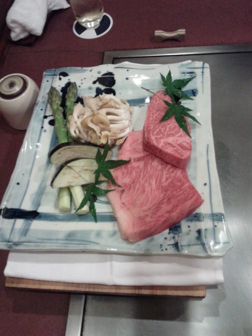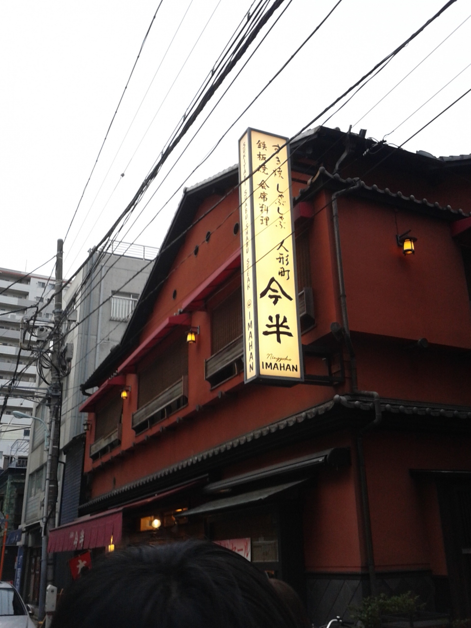 東京での夕食を妻の弟と人形町にある、今半本店にて鉄板焼きを戴いた。1階である。店を入ると女将らしき人に席まで案内された。もちろん事前に予約している。3人用のボックス席に座ると、エプロンをつけてくれて、荷物には布を覆ってくれ、料理人が付いて焼いてくれなどいたせりつくせり。前菜・スープ、お肉・ご飯・デザート。美味しかったです。平日は接待などの会社員が多く、週末は家族連れが多いとのこと。店の外まで見送られました。