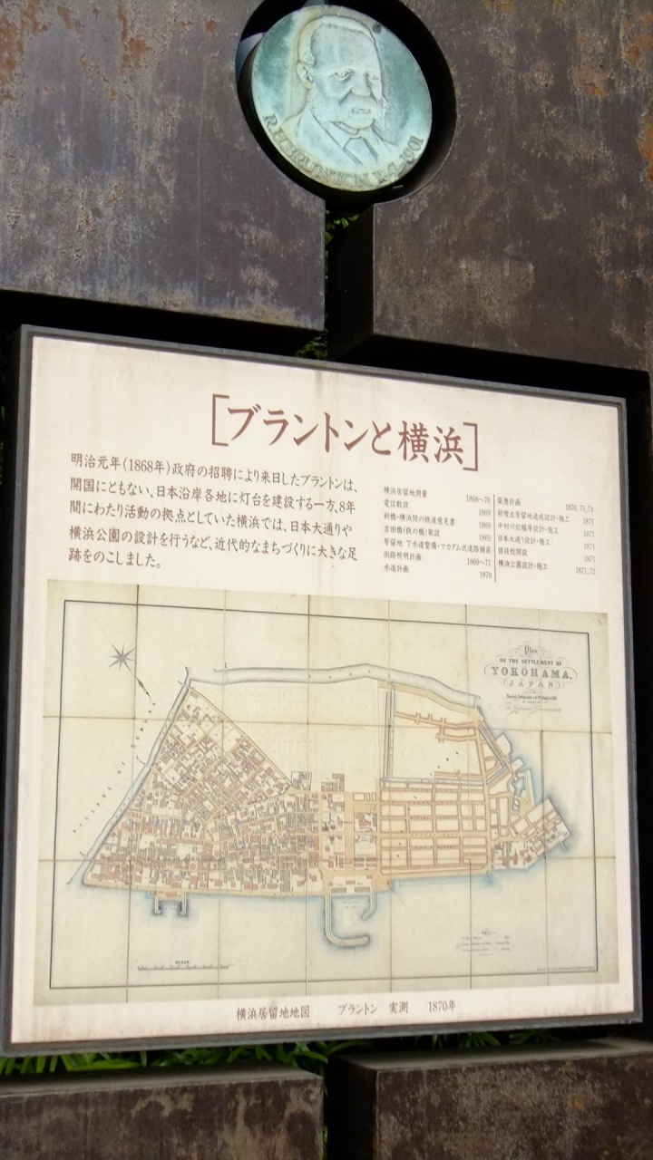JRの関内駅からすぐの場所にある説明板です。伊勢佐木に行くまでの間にあります。今までは気づかなかったのですが、よく読むとブラントンという土木技師と横浜との関係がいろいろわかりました。ブラントンの丸い銅版もあります。