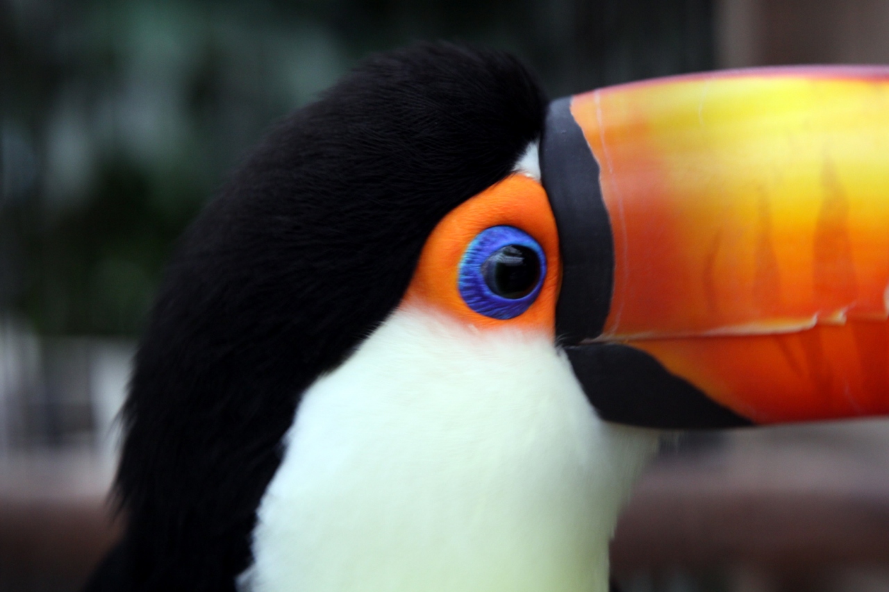 写真のオオハシにマンゴーのスライス(有料)を与えると、じつにかわいらしく繊細についばんで器用に食べる。