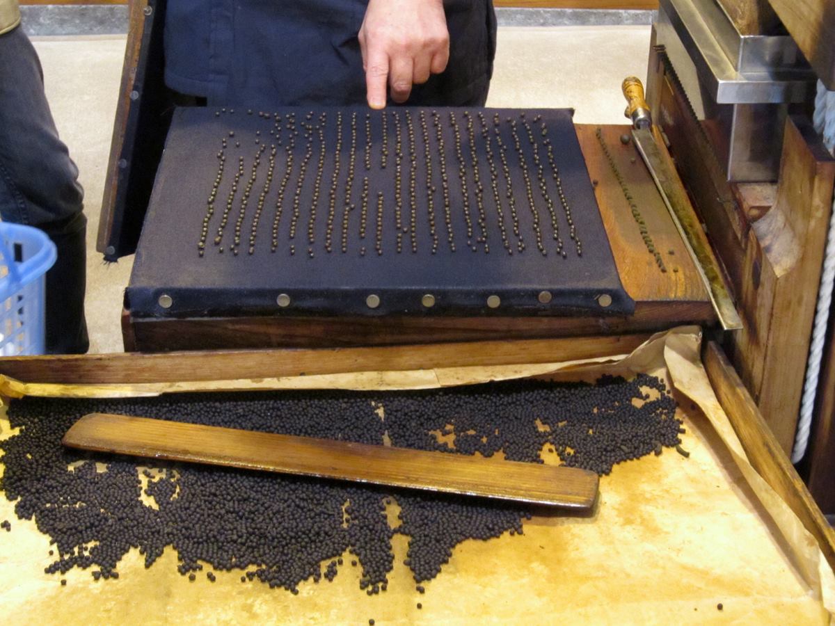 ここ池田屋安兵衛商店では、店内に多くの薬が並びますが薬の販売だけでなく、薬の製造実演も行っています。製麵機のように押し出したねり薬を、適度な大きさに切って並べ、上から板を乗せて丸めていきます。