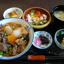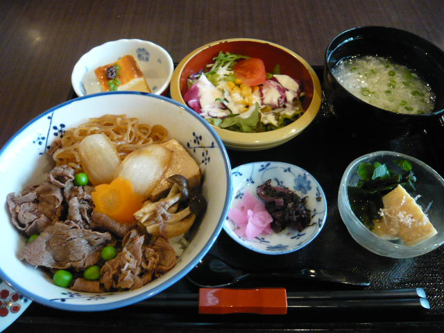 レディースセット1150円を注文。すき焼き丼にたまごスープ、サラダ、たけのことワカメの煮びたし、2種類のしば漬け、ちっちゃいチーズケーキ付き。どれもおいしく頂きました。ららぽーと2階、ダイニングフォーチュン内にあります。