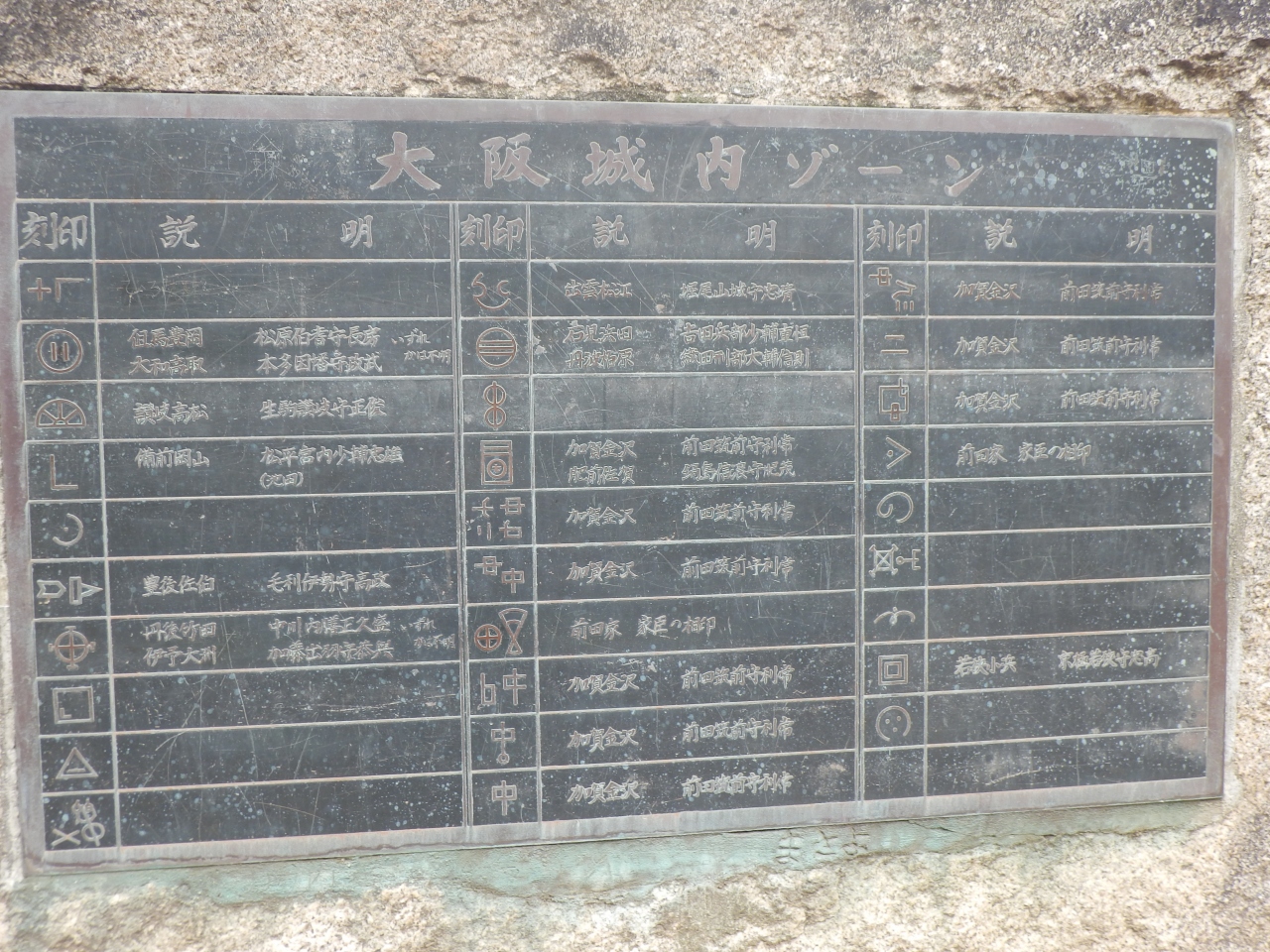 大坂城本丸の裏側、北になります、本丸左側から坂を少し下った広場に徳川時代大坂城再構築をしたとき各藩が分担して石組み,石の持ち込みを行った、各藩は自分の持ち込んだ石に目印として,藩の紋などを刻印していた、石垣修理などで残った石を一か所にまとめて保存している場所があった、集めたのは古い話ではない、添付の写真を見てください沢山の藩が関与していたのが判かります