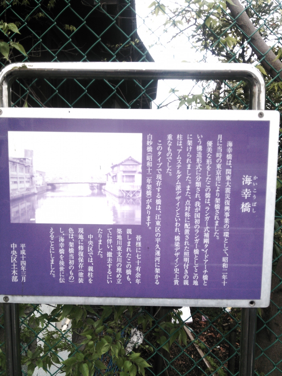 築地の名所、史跡の散策です。江戸時代からの史跡、名所がこの築地エリアにはたくさんありますが、この橋は、関東大震災後の復興事業の一環として、昭和通りののようにインフラ整備の一環で、昭和2年に建設されたアーチ橋です。10年程度前には撤去されてます。